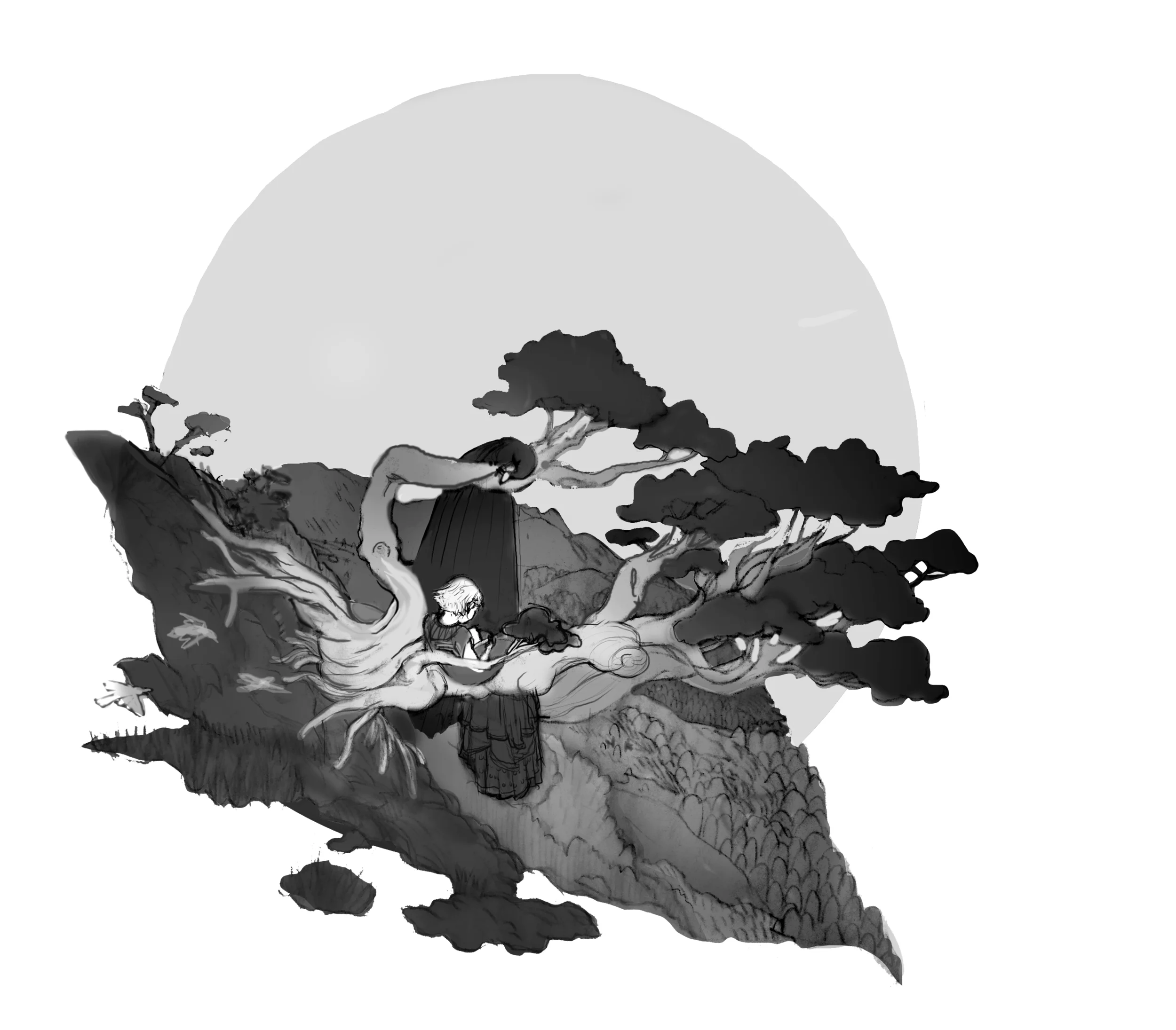 giant little girl nestled between hills, book in lap, robes spilling down the hillside