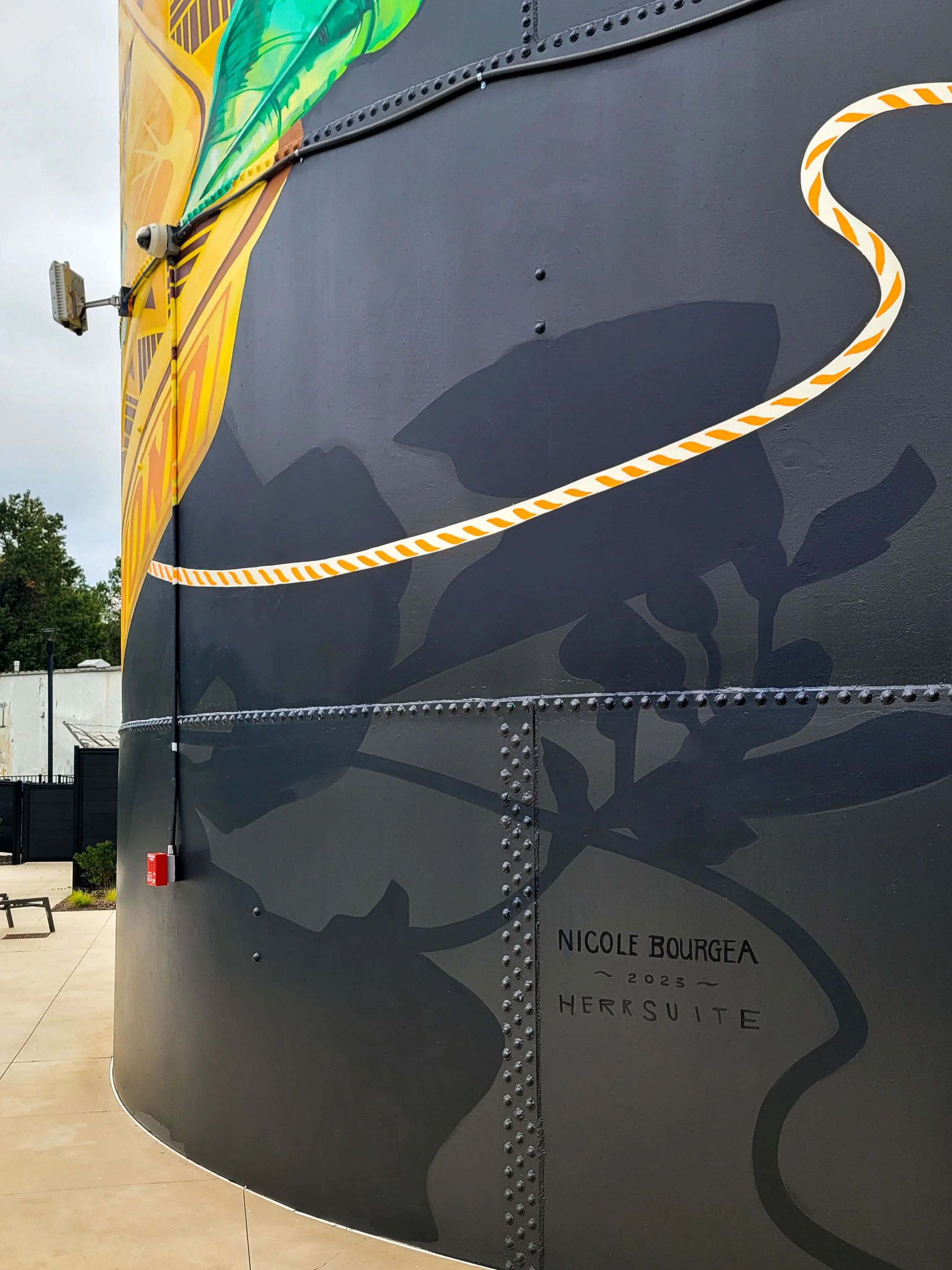 Nicole Bourgea, a prolific muralist from DC, invited me to collaborate on this fun and decorative piece for the Model Tobacco Lofts in Richmond. After chatting online for a few years, this was an opportunity to meet in person and jam on a design together!