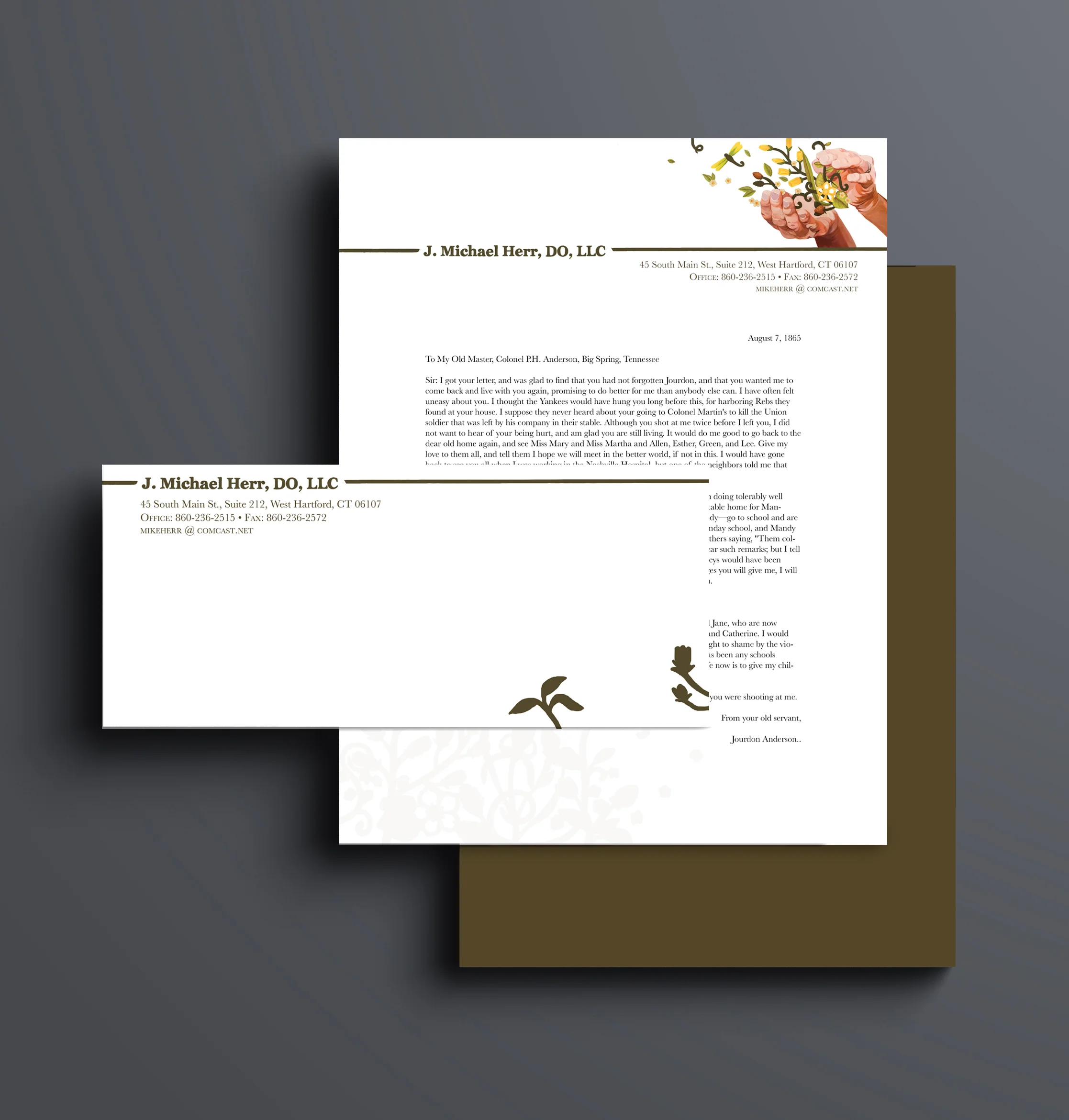 Here's a fancy mockup of the envelope, front of letterhead, and back of letterhead.