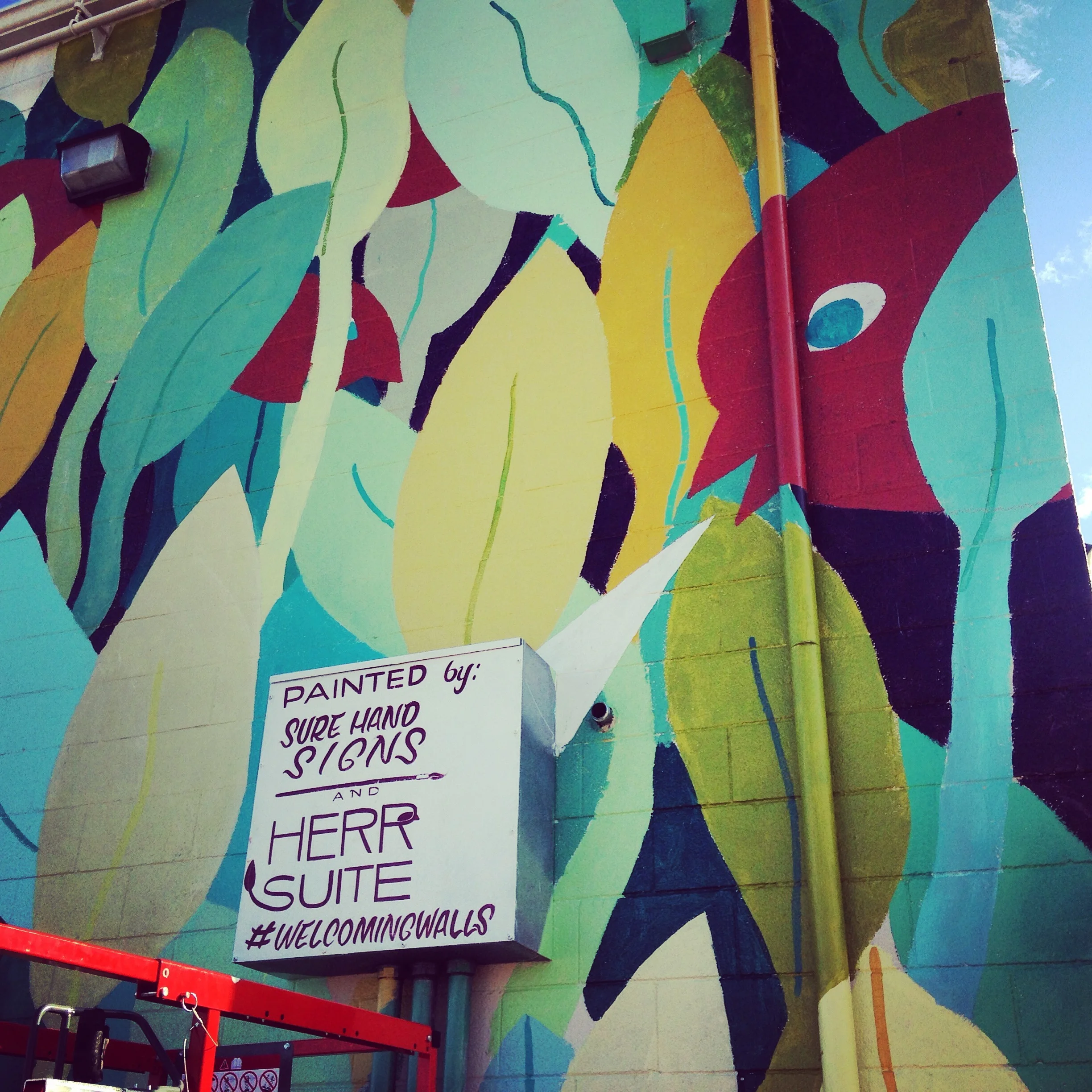 HerrSuite was invited to collaborate on a mural with Sure Hand Signs as part of the new program Welcoming Walls. Our styles work well together - Ross's "Rise and Shine" meshed nicely with a birds-and-plants pattern that you may recognize from a couple of my other small projects.